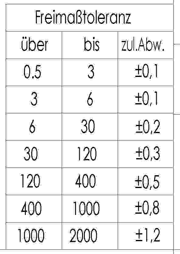 Hallo. Meinst du etwa die Tabelle der Freimaßtoleranzen? (siehe Bild) Da läßt sich sicher was machen. @kaehner keine Angst, Ich haue dich nicht , aber ME10 kann sowas auch. ------------------ Grüße aus dem Schwabenland Dieter Eine Antwort auf diesen Beitrag verfassen (mit Zitat/Zitat des Beitrags) IP |