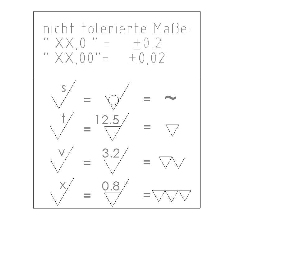 Hallo Leute Bin gerade dabei unsere Zeichnungs Vorlagen zu überarbeiten nun meine Frage od. Bitte hat jemand von Euch eine Tabelle mit denn Allgemeintoleranzen und Oberflächen-Angaben die man ins Blattformat einfügen kann ????