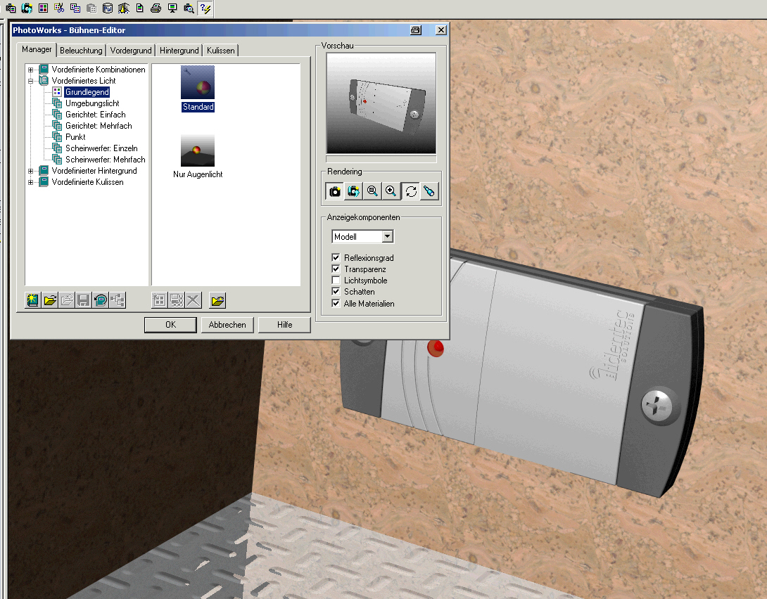 Hallo allerseits, habe seit SWX2003 auch so meine Problemchen mit PhotoWorks, denn ich die Bühnen nicht mehr richtig auswählen.  D.h. ich wähle z.B. „Vordefiniertes Licht“ -> „Grundlegend“, Vorschau wird gerendert, ist auch O.K., dann rendere ich das ganze Bild und es kommt z.B. diese Korkwand. Bei SWX2001+ lief alles noch ordnungsgemäß. Kann das vielleicht an der Installation liegen? Ich habe von 2001+ auf 2003 mittels InstallShield upgedatet, also nicht zuerst alles deinstalliert und dann neu installiert. Hat jemand auch solche Erfahrungen gemacht oder weiß’ einen guten Rat? Besten Dank im voraus