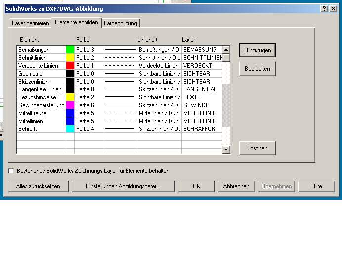 So, nun scheints zu funktionieren.. also Ralf, auf dieser Tafel "layers definieren" gibts du an was für layers im fremden cadsystem erzeugt werden sollen. auf der anderen Tafel "elemente abbilden" weist du deinen SWX Elementen ein definiertes layer zu. und das funktioniert!!!!!!