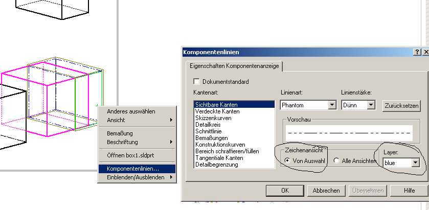 Hallo Awanger, das mit dem Anhang funktioniert soweit, aber es gibt keine möglichkeit z.B. einen Layer von SWX zum Layer von DXF/DWG zu exportieren. Alternativdarstellung ist ja nichts anderes als Körperkanten mit der Linienart Phantom und Linienstärke dünn. Gruß Ralf Eine Antwort auf diesen Beitrag verfassen (mit Zitat/Zitat des Beitrags) IP |