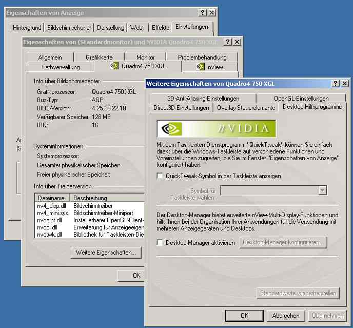 PNY Aktion alt gegen neu genutzt, ELSA Gladiac 511 und ELSA Synergy raus, Synergy gegen Quadro 750 XGL getauscht und diese rein. Neue Festplatte rein und komplett neu aufgesetzt die Maschine. Soweit sogut. Nur dass sich Visio (nutzen wir für Hydraulikpläne) festfuhr, sobald man auf die Menüleiste klickte. Graka Treiber war SWX