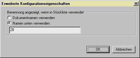 geh mal in Eigenschaften der Konfiguration: ConfigManager / RMB auf der Config / Konfigurationseigenschaften - Erweitert ... vermutlich ist dort der "Punkt" bei - Dokumentnamen verwenden. Setz die andere Option und schreib in das Feld darunter rein was Du willst. Das ist dann das was in der Stückliste unter Benennung erscheint [edit] ein Bild sagt mehr als 1000 Worte ... ------------------ mfg uc [Diese Nachricht wurde von u.clemens am 23. Januar 2003 editiert.] Eine Antwort auf diesen Beitrag verfassen (mit Zitat/Zitat des Beitrags) IP |