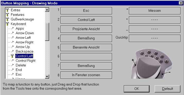 Zitat: Original erstellt von Ueli: ...Was ich bis jetzt noch nicht geschafft habe, aber das liegt ev. an meiner Tastatur, den Control (STRG.) Befehl auf den Spaceball zu legen...