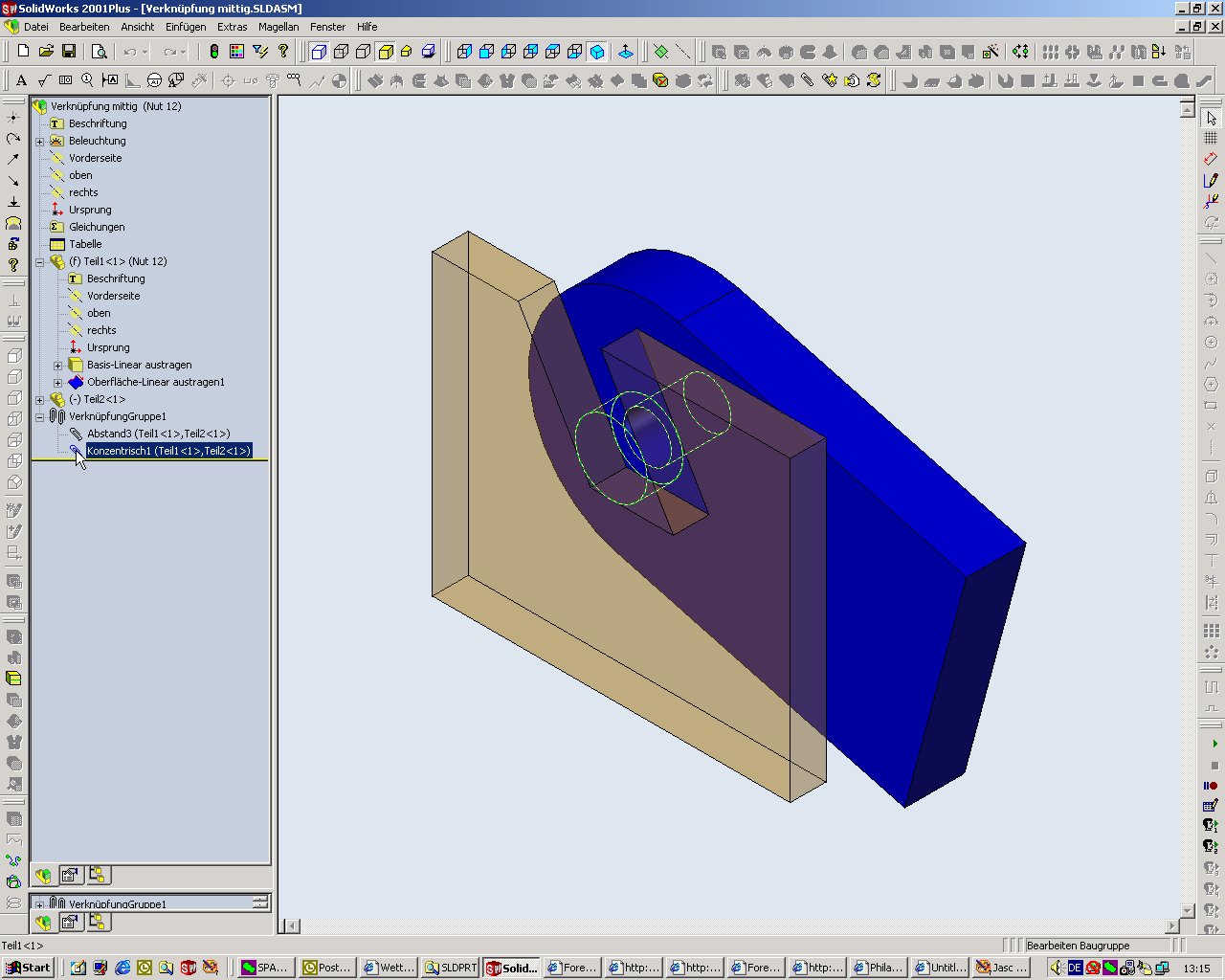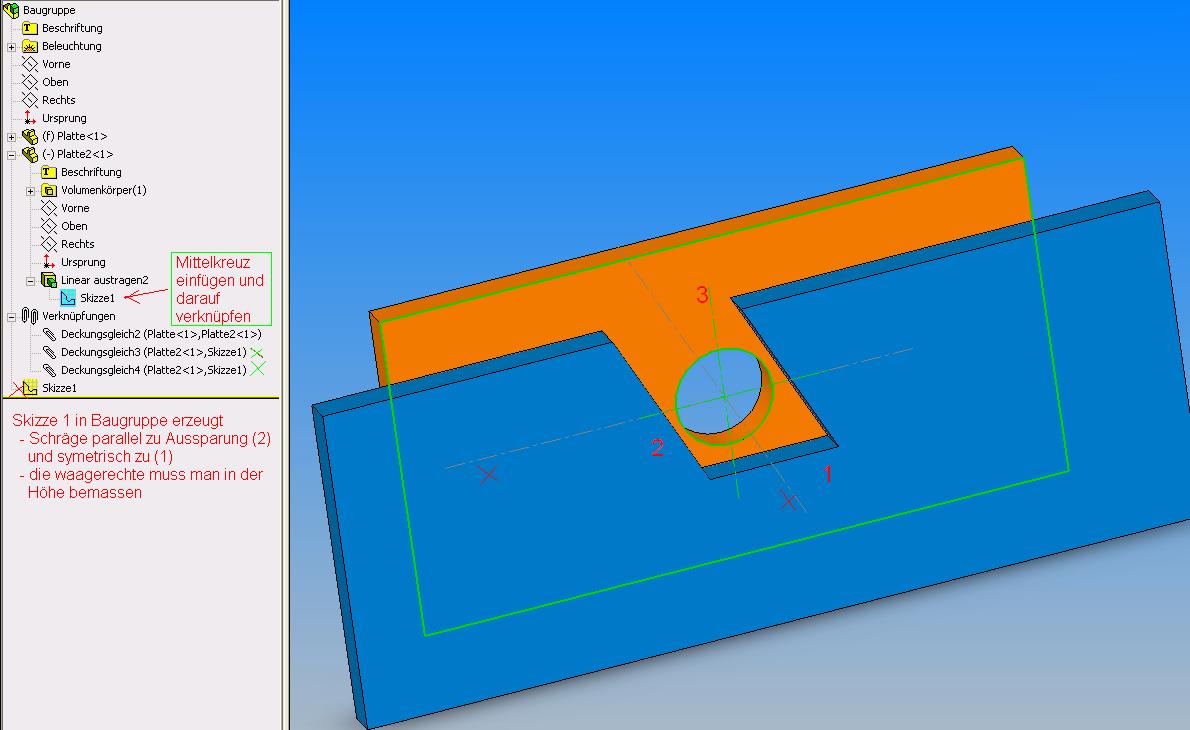 Hallo Kirk, du kannst ja auch in dem Teil mit der Bohrung eine zusätzliche Ebene die durch die Bohrungsmitte geht erstellen. Diese kann man dann symmetrisch zu den beiden seitlichen Flächen des Vierkantausschnitts verknüpfen. Hat leider den Nachteil, daß das Teil mit der Bohrung nicht mehr um die Bohrungsachse drehbar ist. Es gibt, wie du siehst mehrere Möglichkeiten um zum Ziel zu kommen. Welche davon die beste ist hängt letztendlich von der kompletten Konstruktion (Aufbau der Modelle, Einbausituation...) ab. Gruß,