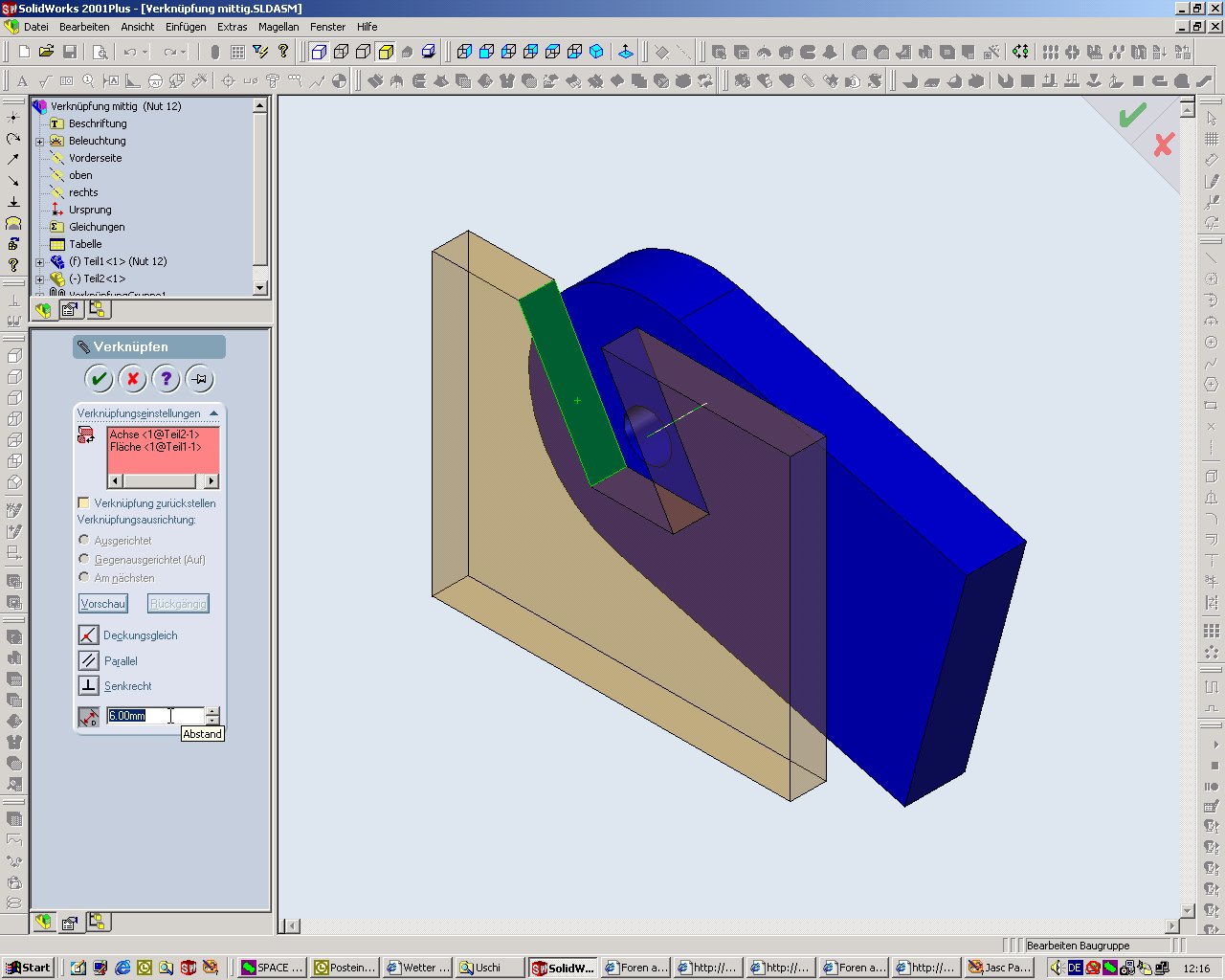 Hallo Kirk, wenn man die temporären Achsen einschaltet (Ansicht => temporäre Achsen), kann man die Bohrungsachse mit den Nutflächen mittels „Abstand“ verknüpfen. Eine weitere Möglichkeit wäre, im „Nutteil“ eine zyl. Hilfs-Oberfläche zu erzeugen und diese mit der Bohrung konzentrisch zu verknüpfen (danach RMB „Oberflächenkörper ausblenden). Wenn dann auch noch der Oberflächenkörper in tangentialen Beziehungen zu den Nutflächen steht und verschiedene Nutbreiten über Konfigs gesteuert werden, positioniert sich die Bohrung immer Mitte Nut.