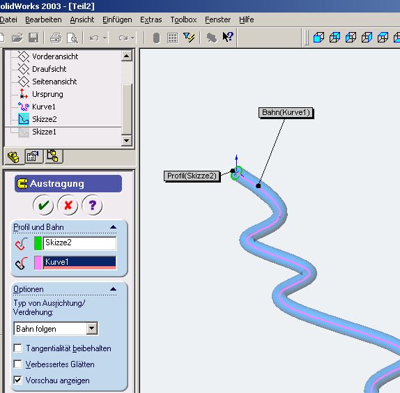 Auch Tach Keule  , bei mir geht's  siehe Bild. Ich kann die Kurve als Element auf eine Skizze übernehmen (dafür hab ich Skizze1 verwendet) oder meinen Kreis (Skizze2) an die Kurve anstecken und entlang der Kurve austragen. Wenn ich die Kurve verändern will: RMT auf das Feature->Definition bearbeiten und die Tabellenwerte editieren. Beste Grüße & bis demnäx Ralf ------------------ Eine Antwort auf diesen Beitrag verfassen (mit Zitat/Zitat des Beitrags) IP |