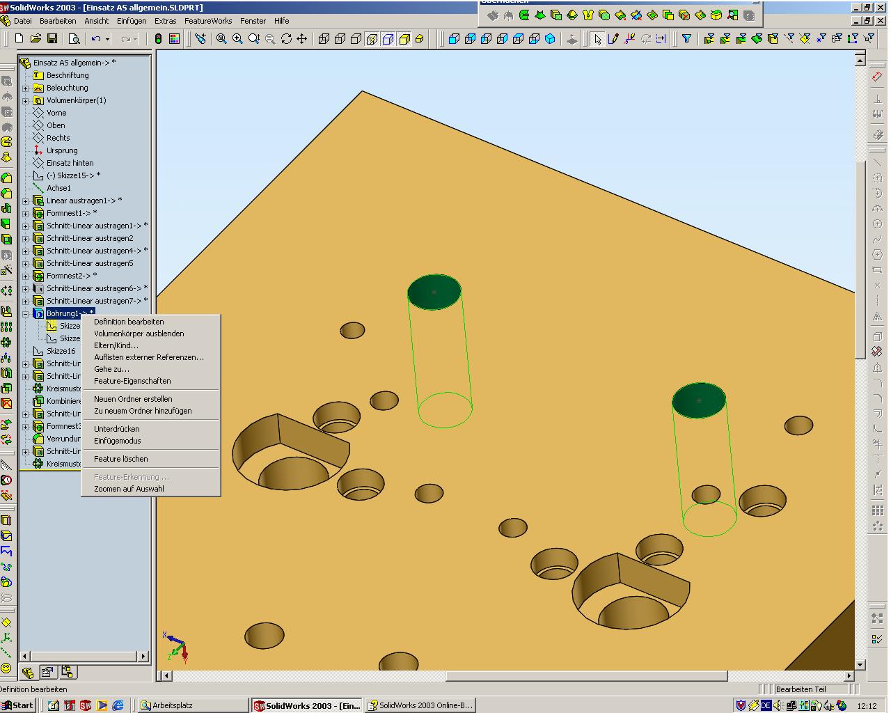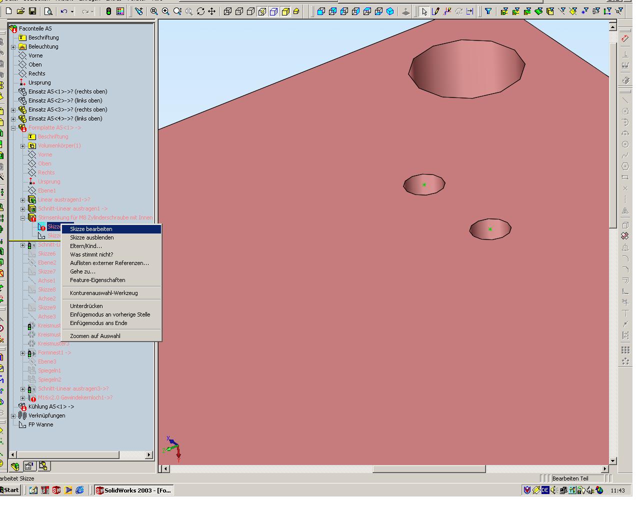 Hallo Ralf, ja das mit der Shift-Tast und dem anschließendem Verschieben funktionert schon, nur muß ich dann meine Bohrpunkte neu bemaßen, bzw. neu verknüpfen. Ich dachte das Ebenenbearbeiten funktioniert so wie bei einfachen Skizzen...naja, ich werd dir wohl glauben müssen. Aber ich muß doch die Ebene für Bohrungen neu anwählen können? Gruß Rainer