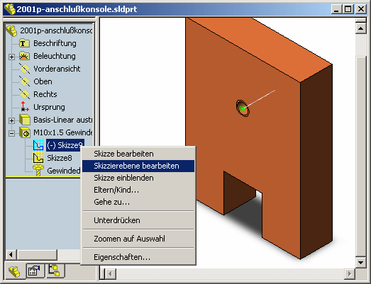 Hallo Rainer, ich finde das gar nicht so schlimm mit dem DragDrop, wenn man es erst mal weiß ist es einfach (steht z.B. auch auf http://solidworks.cad.de/khmini/khmini017.htm ) [EDIT]Ich hab beim herumspielen mit diesem Problem eine interessanten Entdeckung gemacht. Schaut euch mal den Screenshot an  Wenn man das Bohrungsassistenten-Feature auf einer Ebene erstellt, dann hat die Skizze auch anschließend die Möglichkeit, die Skizzierebene zu editieren. Dann kann das auch auf eine "normale" Fläche gelegt werden und behält diesen Menupunkt trotzdem bei. [/EDIT] Ciao, Stefan ------------------ Inoffizielle deutsche SolidWorks Hilfeseite http://solidworks.cad.de Eine Antwort auf diesen Beitrag verfassen (mit Zitat/Zitat des Beitrags) IP |