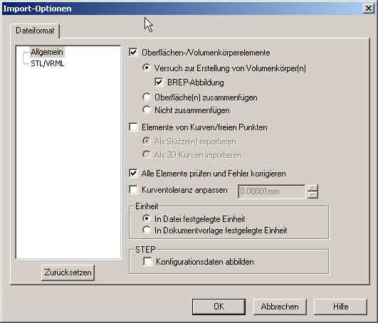 Hallo Markus, ob sich ein Volumenköper aus den Flächen machen läßt, hängt zum einen von der Güte und zum anderen vom Inhalt der IGES-Datei ab. In der Voreinstellungen kann man festlegen, ob wenn möglich ein Volumen generiert werden kann oder ob alle Flächen zu einer einzigen zusammengefasst werden sollen. Gelingt die Volumenerstellung nicht beim Import, bleibt höchstens noch die Möglichkeit die Flächen mit einer sehr kleinen Dicke zu versehen und daraus ein Quasi-Volumen zu generieren. Dies geht aber nur in seltenen Fällen, wenn die Struktur nicht zu viele Konkav-/Konvexwechsel aufweist. Ansonsten kann man die Flächen bestenfalls noch als Endebedingung für Features verwenden. mfg VK Eine Antwort auf diesen Beitrag verfassen (mit Zitat/Zitat des Beitrags) IP |