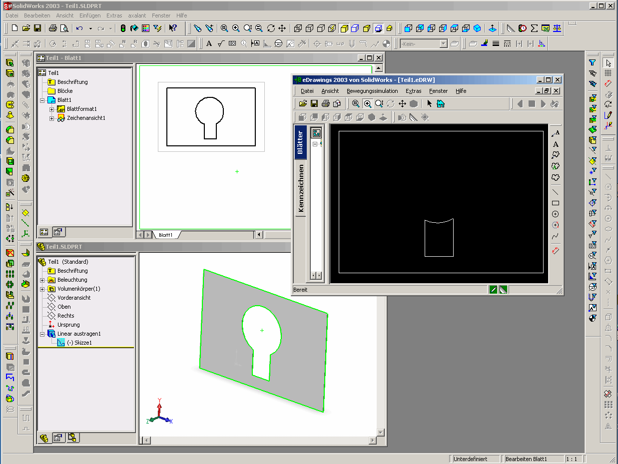 Hallo SWX  -Gemeinde :-) Ich habe eine Fehler beim Konvertieren von SWX nach DXF entdeckt. Dieser Fehler tritt nur bei SW2003/SP3 auf. Und zwar hat SolidWorks offensichtlich Probleme bei Radien ab 180°. Schaut mal in mein Beispiel. Das "Schlüsselloch" in meiner Blechabwicklung sieht nach dem Konvertieren ziemlich deformiert aus. Kann das jemand nachvollziehen? Peace :-) Horschtle