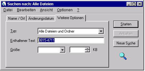 Moin Axel, unter WinNT kann man auch sehr gut über das Windows-Standard-Suchprogramm nach enthaltenem Text in SWX -Eigenschaften suchen: Start - Suchen - Dateien/Ordner - weitere Optionen Wenn Du z.B. nach der Zeichnungs-Nr. 0815-4711 suchst, siehe Dateianhang. Das geht wesentlich schneller, als mit dem SWX -Explorer. Unter WinXP funktioniert das leider nicht mehr ... Viele Grüße ------------------ Jörg M. Eine Antwort auf diesen Beitrag verfassen (mit Zitat/Zitat des Beitrags) IP |
