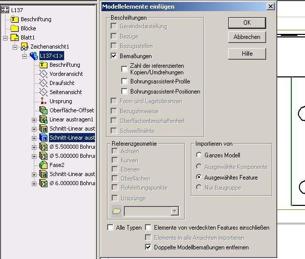 Hallo Thomas, ich habe es mir abgewöhnt in Zeichnungen zu bemaßen. Ich importiere immer die Modellelemente und verschiebe diese ggf. in die gewünschte Ansciht (mit gedrückter Shift-Taste). Nur bei Bohrungen mit dem Bohrungsassistenten lassen sich die Durchmessermaße manchmal nicht verschieben. Dann hast Du auch den Vorteil, dass Du das Modell aus der Zeichnung heraus ändern kannst. Noch ein weiterer Trick: Oft erscheinen in einer Ansicht viele Maße und man löscht einen Großteil dieser Maße weg. Nach einer Weile merkt man dann, dass man Maße gelöscht hat die man doch noch braucht. Und jetzt? Wenn man die Modellmaße wieder einblendet hat man wieder hunderte ;-) von Maßen in der "schönen" Ansicht. Also was mache ich nun: Ansicht zweimal projezieren (oder eine benannte Ansicht einfügen) und nur dort die Modellelemente einfügen und in die "schöne" Ansicht ziehen. Die Hilfsansicht kann man dann wieder löschen. Ich hoffe jetzt ist alles klar! Gruß Marc  Eine Antwort auf diesen Beitrag verfassen (mit Zitat/Zitat des Beitrags) IP |