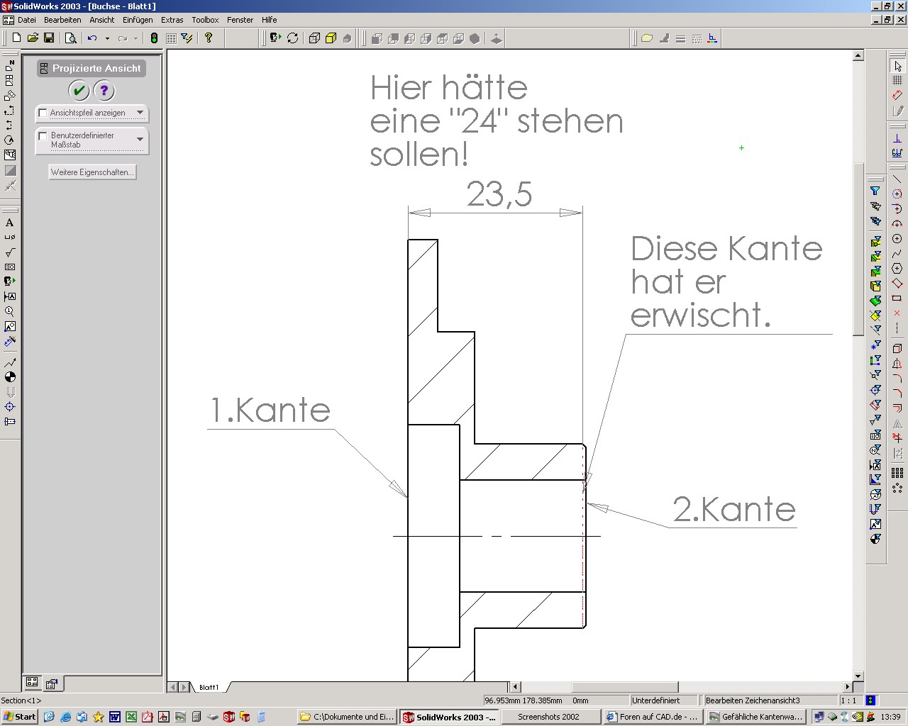 Hallo Konstrukteure, wie kann ich verhindern, daß im Zeichnungs-Dokument in einem Ausbruch verdeckte, nicht dargestellte Kanten beim Bemaßen ausgewählt werden. Es ist folgendes passiert: Nach unserer Zeichnung hat unser Kunde 48 solche Buchsen (gefräßte Flächen, Teilkreisbohrungen, gehärtet, geschliffen) gefertigt. Die Maße nach Zeichnung sind i.O. Nur der Zusammenbau klappt nicht. Sie sind zu kurz. Beim Nachmessen des Modells in SWX  stellte sich heraus, daß das in der Zeichnung angetragene Maß statt 24+0,05 nur 23,8+0,05 war. Wie kam es dazu? Beim Bemaßen in der dargestellten Antippreihenfolge bemerkte ich nicht, daß SWX  die unsichtbare Kante der 0,2er Phase erwischt hat. Und auf der Zeichnung hat das auch keiner gesehen. (Im Bild habe ich die 0,2er Phase größer (0,5) gemacht, damit Ihr auch was seht.) Hoffentlich sagt jetz keiner, ich solle keine Ausbrüche mehr machen bzw. darin bemaßen.  Viele Grüße ... und seid alle gewarnt vor meinem Fehler, denn das wird eine teure Schmiere Thomas Eine Antwort auf diesen Beitrag verfassen (mit Zitat/Zitat des Beitrags) IP |
