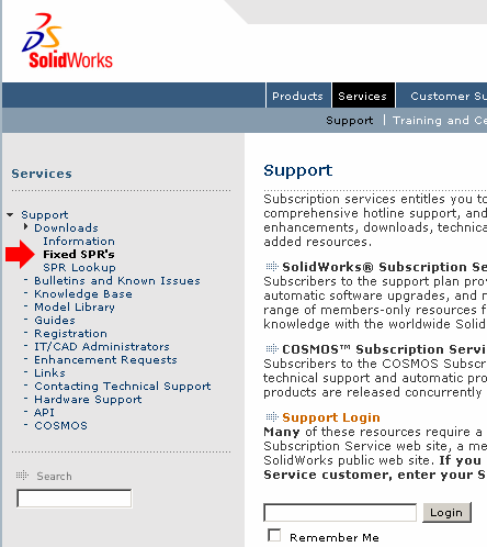 Hallo Monika, und herzlich willkommen im Forum.  Welche Probleme in den verschiedenen Servicepacks gelöst worden sind kannst du im Supportbereich auf der SolidWorks-Webseite sehen. Wenn du in den Bereich Downaload gehst kannst du dort auch die Übersicht der "Fixed SPR's" anwählen (siehe Bild) Im Fall des SP4.1 wurde der SPR 182841 (SolidWorks prompts 'file xxxxx cannot be opened; there are too many open files when 20+ people try to access same file concurrently.) gelöst. Ciao, Stefan ------------------ Inoffizielle deutsche SolidWorks Hilfeseite http://solidworks.cad.de Eine Antwort auf diesen Beitrag verfassen (mit Zitat/Zitat des Beitrags) IP |