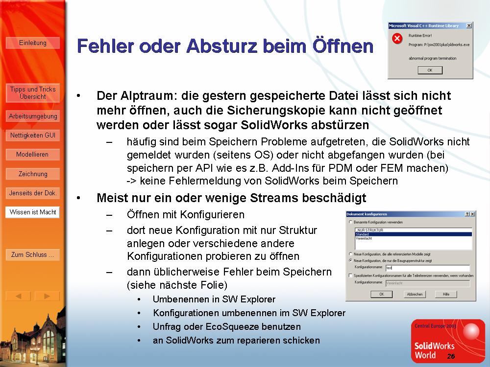 Ich hab dir mal ein Bild von meinem Vortrag aus Landau angehangen, da stehen ein paar Tipps drin, wie du die Datei vielleicht doch noch aufbekommst. Falls du die in SW2003 noch aufkriegst versuch die mal einfach unter einem anderen Namen zu speichern, dass hilft auch manchmal.