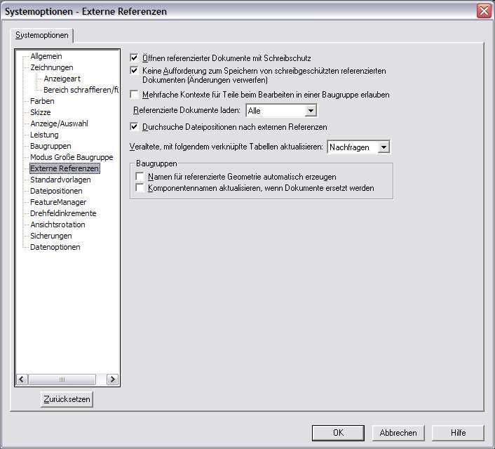 juhuu... ich kann mal nen richtig guten Tipp weitergeben.. hihi.. AAALSO: 1. in SolidWorks den Haken bei den Externen Referenzen raus nehmen.. 2. DBWorks - Optionen - Umgebung - "Die Optionseigenschaften (externe Referenzen) von SolidWorks nicht verwenden"... unbedingt Häkchen rein!, sonst überschreibt DBWorks das bei jedem Neustart wieder in SolidWorks. Dann sollte es funktionieren. Tschö... Ramona ------------------