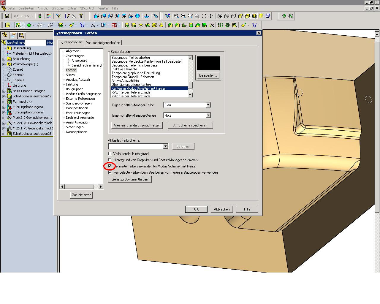 Wenn ich Teile erstelle sind die Körperkanten immer schwarz. das macht sich gut bei Verknüpfungen. Bei Import-Teilen sind die Kanten aber immer sehr schlecht zu erkennen und man wird zeitweise wahnsinnig wenn man zum x-ten mal die Fäche und nicht die Kante ausgewählt hat.