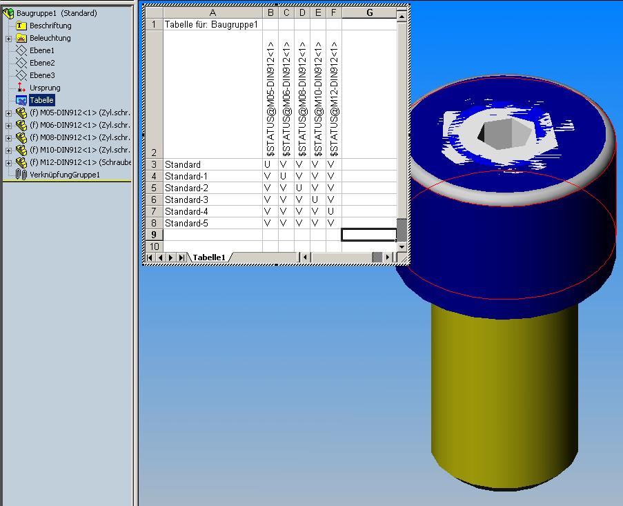Danke für eure Unterstützung! Meine Absicht ist es nun eine große BG (schon fast fertig) zu erstellen. Hierfür möchte ich dann eine Tabelle "einfügen/erzeugen (?)". Mit dieser Tabelle soll dann eine best. Baugruppe konfiguriert werden, die man "einfach" über die Tabelle steuert, welche Teile bzw. BG eingeblendet/nicht unterdrückt sind. Wie könnte so eine Tabelle aussehen. Kann ich überhaupt über eine Tabelle Teile/BG unterdrücken oder nicht unterdrücken oder gilt das nur für Feature? Was sollte ich sonst dabei beachten?
