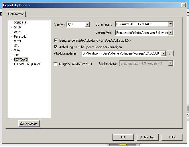 Wenn du beim DXF Export die Option "Ausgabe im Maßstab 1:1" aktivierst gibt SolidWorks als Voreinstellung den Maßstab, die für die meisten Ansichten gilt, deswegen ist Blattmaßstab praktisch nie voreingestellt, da die meisten Ansichten ja im Blattmaßstab sind und dadurch in der Überzahl (das bedeutet dieses "Anzahl=" hinter dem Maßstab).