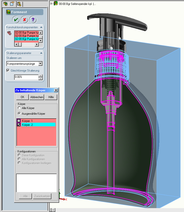 Hallo Sandro, ich gehe folgendermassen vor: Neues Teil "Inhalt" in Baugruppe einfügen, so gross, dass der Behälter auch gefüllt wird. Danach Inhalt anwählen "Teil bearbeiten" "Einfügen, Feature, Formnest... " dann alle Teile anwählen, die mit dem Inhalt in Berührung kommen, fertig. Durch unterschiedliche Höhen des Inhalts kann man auch komfortabel Litermarkierungen anbringen, und die stimmen dann sogar! Gruss Markus Eine Antwort auf diesen Beitrag verfassen (mit Zitat/Zitat des Beitrags) IP |