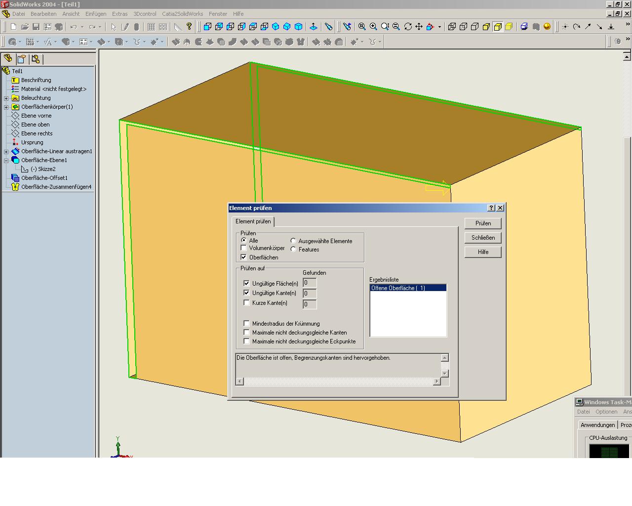 Hallo Ich habe mehrere Oberflächen die ich nun zusammenfüge und daraus ein Volumenkörper erstellen will. Nun kann aber kein Volumenkörper erstellt werden, da anscheinend die Flächen nicht genau zusammengefügt sind. Gibt es nun ein Befehl, der mir die Lücke zwischen den Oberflächen anzeigt oder muss ich den Fehler mühsam selber suchen? Gruss Faes