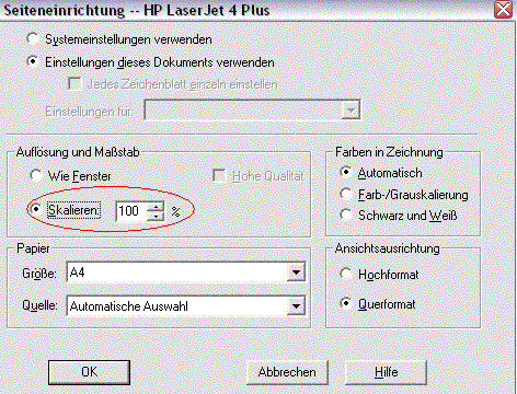 Tja, zu diesem Drucker kann ich nichts sagen, auf meinem HP4050 druckt er diese Beispiel in X-Richtung korrekt, in Y-Richtung wird das Quadrat ca. 1/2mm zu groß, das liegt am Vorschub des Druckers. Ich schätze mal, da werden die meisten Drucker nicht ganz korrekt arbeiten...aber das hilft dir jetzt auch nicht. Hat dein Kollege den selben Treiber installiert? Gibts für den Drucker einen PS-Treiber? Vielleicht gehts damit besser. Wir hatten mal einen Calcomp-Plotter, dort konnte man die X- und Y-Skalierung im Setup korrigieren, hat dein Drucker/plotter so etwas auch? Sorry, ansonsten weiß ich auch nichts sinnvolles mehr dazu zu sagen. ------------------ Klaus Massler www.al-ko.de privat... KLAMM? Was ist KLAMM? Eine Antwort auf diesen Beitrag verfassen (mit Zitat/Zitat des Beitrags) IP |