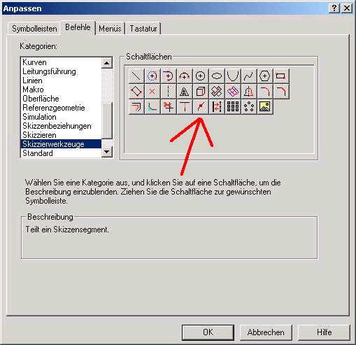 Hi Nils, mit Extras->Skizzieren->Teilen kannst du Linienelemente teilen, so erhälst du neue Punkte. Der Button befindet sich unter Extras->Anpassen->Befehle->Skizzierwerkzeuge->Button auf gewünschte Befehlsleiste ziehen. ------------------ Gruß Benny [Diese Nachricht wurde von benny1 am 09. Dez. 2004 editiert.] [Diese Nachricht wurde von benny1 am 09. Dez. 2004 editiert.] [Diese Nachricht wurde von benny1 am 09. Dez. 2004 editiert.] Eine Antwort auf diesen Beitrag verfassen (mit Zitat/Zitat des Beitrags) IP |