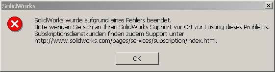 Ich arbeite noch mit SWX2003, seit der Installation des SP5 bin ich von dieser Meldung (bis jetzt) verschont geblieben. Davor jedoch bekam ich diese Meldung auch immer wieder mal zu sehen. Vom Administrator kam folgende Anweisung: ----------------- mit der Installation des Servicepack SP5.0 von SolidWorks sollten die Abstürze behoben sein. Treten dennoch Abstürze auf, wird von SolidWorks im Hintergrund eine Protokolldatei mitgeführt, welche im SW-Installationsverzeichnis abgelegt wird. Normalerweise befindet sich die Installation unter C:\ oder D:\Programme\SolidWorks. Hier muss sich die Datei mit dem Namen: ">>Rechnername<< Performance.log" befinden. Wird SolidWorks ohne Vorwarnung beendet, sollte mir jeder, bis auf weiteres, das Log-File zuschicken (bitte sofort nach dem Absturz) und dann die Datei lokal löschen. Das Log-File wird nach dem Start von SolidWorks wieder neu angelegt. ------------------ 5-10 Abstürze am Tag!?!