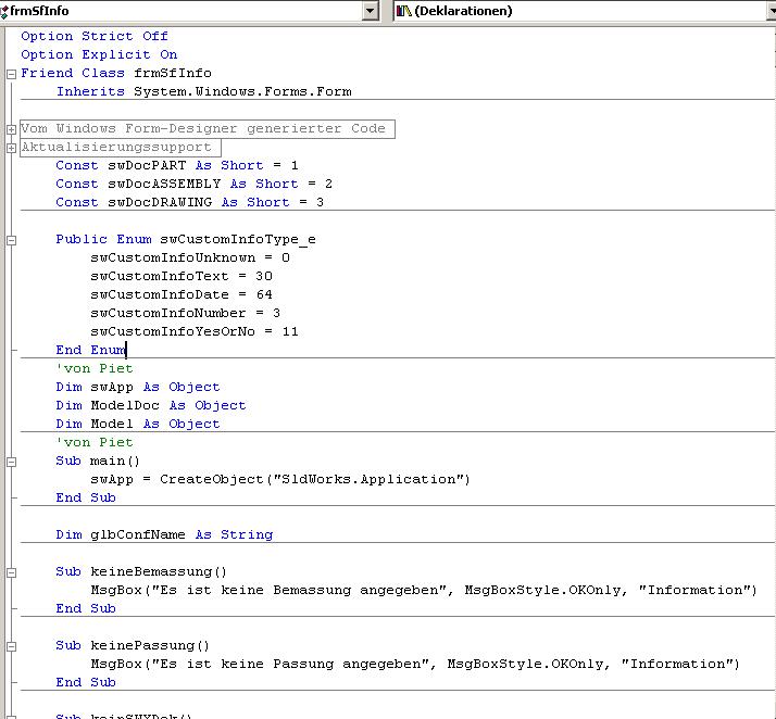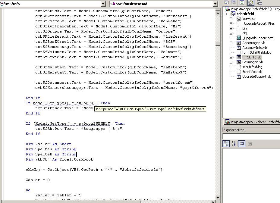Vor einiger Zeit hat hier ein netter Mensch (ich weiß leider nicht mehr, wer) ein VB-Programm zur Verfügung gestellt, mit dem komfortabel benutzerdefinierte Eigenschaften an Modelle angehängt werden können, und die dann automatisch in Schriftfelder von Zeichnungen angehängt werden. Ich versuche nun, dies Programm an meine Bedürfnisse anzupassen. Da ich nur VB.Net zur Verfügung habe, wurde der Code (in VB6 geschrieben) konvertiert. Beim Versuch, den Code zu Kompilieren, wird eine lange Fehlerliste angezeigt. Einige konnte ich schon bereinigen, aber jetzt stehe ich auf dem Schlauch. Die dringendste zuerst: Der Operand "=" ist für die Typen "System.Type" und "Short" nicht definiert. Diesen Code hab ich unverändert übernommen, das müsste also in der ursprünglichen Version funktionieren. Die angehängten Bilder Schriftfeld1 und Schriftfeld2 zeigen Screenshots. Die andere Fehlermeldung lautet "SelStart" ist kein Member von System.Windows.Forms.Control Diese Meldung (siehe Bild Schriftfeld3) bezieht sich direkt auf VB6, was ich da bei VB.Net einsetzen muss, ist mir nicht klar. Ich bin ein Anfänger in Visual Basic (in Programmierung sowieso), VB6 kenn ich immerhin etwas, VB.Net ist neu für mich. Für alle hilfreichen Tipps bin ich sehr dankbar. Piet