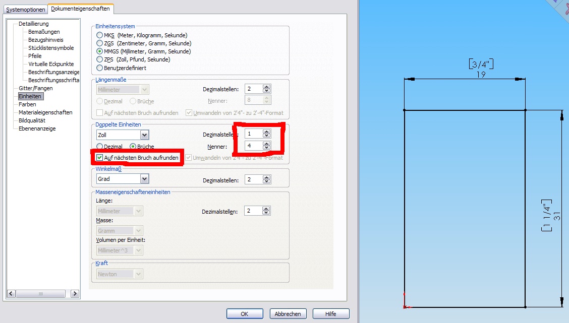 liebes forum zuerst mal, die neue suchfonktion hat mich zimlich verwirrt, da kommt ja was von google und da sind links drin wo nicht zum forum führen  aber was solls zu meinem problemchen, ich versuche für unsere kollegen in kanada, was eigentlich metrisch wäre, zeichnungen zu bemassen und zwar in mm und zoll. tut eigendlich recht gut nur bei 19.05mm gibt mir SWX immer 1" an anstelle von 3/4". wie kann ich das SWX abgewöhnen oder beibringen. danke für eure mithilfe gruss aus murten thomas Eine Antwort auf diesen Beitrag verfassen (mit Zitat/Zitat des Beitrags) IP |