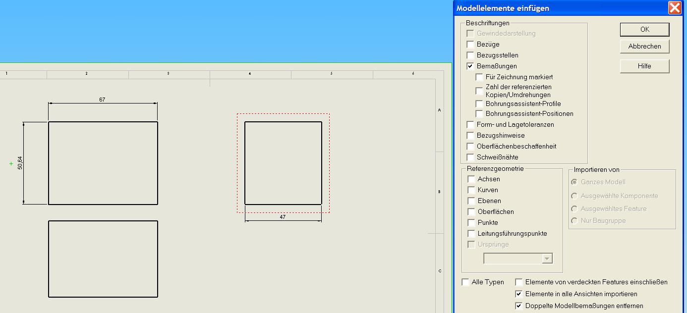 Hallo, man kann auch noch im Menü "Modellelemente einfügen" selbst umschalten. Das Feld heißt dort "Duplikate eliminieren". (Die direkt in die Zeichnung eingefügten Maße werden natürlich trotzdem nicht berücksichtigt). Wenn man beim Modellieren ein Maß öfters benötigt, das nur einmal in der Zeichnung auftauchen soll, dann kann man mit der Eigenschaft "Für Zeichnung markiert" arbeiten. Die ist derzeit bei allen Modellmaßen standardmäßig gesetzt. MfG WLT Eine Antwort auf diesen Beitrag verfassen (mit Zitat/Zitat des Beitrags) IP |