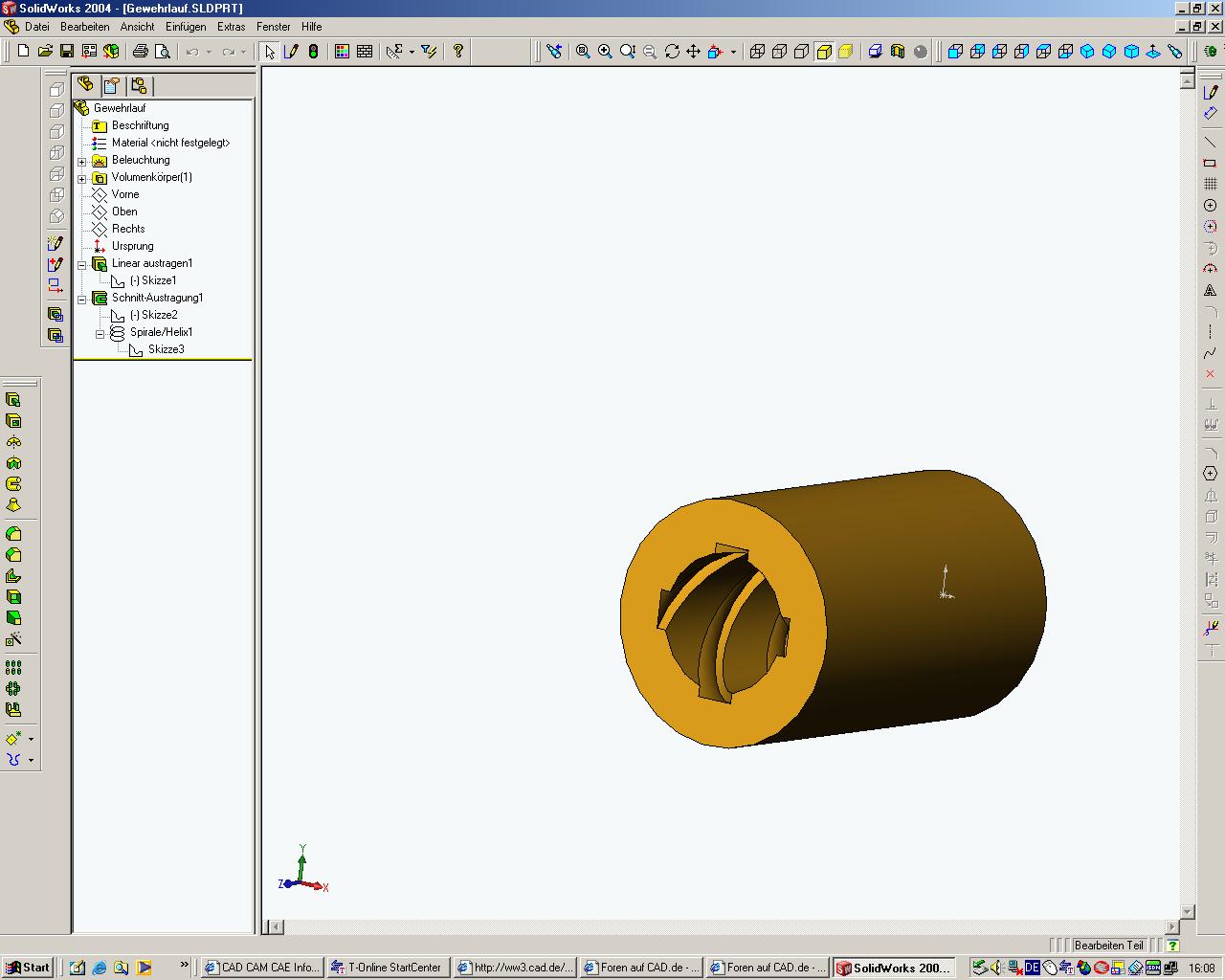 Hallo erst mal zusammen!:-) Eigentlich komme ich ganz gut zurecht mit Solid Works, doch manchmal gibt es ein paar knifflige Dinge, die ich mir leichter vorstelle als sie sind. Ich bin in der Waffen Branche (Jagd und Sportwaffen) tätig und sollte für einen Kunden eine Konstruktion abliefern. Dazu gehört auch der Gewehrlauf (ein Rohr, durch den die Geschosse getrieben werden). Dieser Lauf hat ein Innenprofil (siehe jpg) welches sich über die gesamte Länge ca 1x bis 2x um seine Achse dreht (in Form eines Wendel)auch "Drall" genannt. Ich habe dies bis jetzt jodoch nur geradlinig ausgetragen. Wer kann mir hier etwas weiter helfen, damit das Profil noch ein Wendel wird? Vielen Dank im Voraus für eure Mühen.:-)