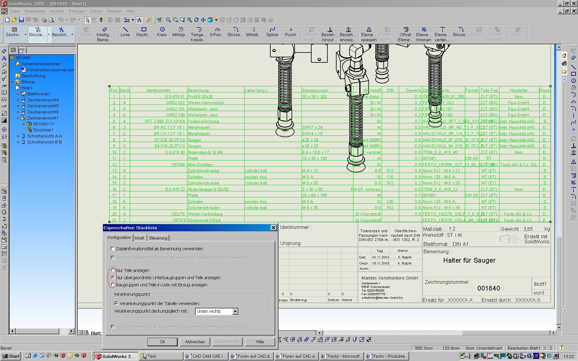 ... und dann ein bom zu machen, aber das resultat ist nicht so zufriedenstellend ... Ich interpretiere das so: Das Ergebnis enthält auch Baugruppen. Du kannst in den Eigenschaften der Stückliste auf "einstufig" umstellen, dann werden nur die Einzelteile aufgelistet, die Menge wird dann entsprechend angepaßt. Das geht aber nur bei der 2004-eigenen Stücklistenfunktion (nicht excelbasiert). Die Stüli kannst du unter rechte Maustaste- Vorlage speichern als TXT oder CSV abspeichern und in Excel einlesen (dort dann Daten-Sortieren). Falls Du eine Excelstückliste integriert hast, ist die obige Vorgehensweise nicht die richtige.