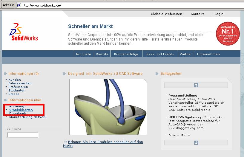 Beim Update auf sp4 Solid Works2004 gab es eine html-Datei um nachträglich noch alle Änderungen zu efahren, welche im Handbuch nach dem Druck nicht mehr Anwendung fanden. Hier gab es auch einen Link zu einer Seite aller getesteten Grafikkarten und Treiber.