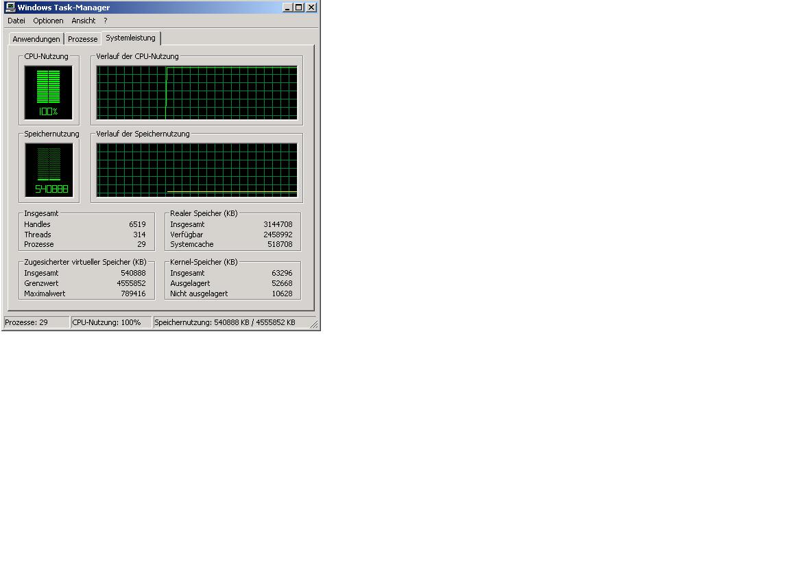 Diese Anpassungen (boot.ini, virt. Speicher) sollte aber von Leuten gemacht werden, die Ahnung davon haben!Also nochmal, schau mal im normalen Alltagsgeschäft wie sich die Hauptspeicherbelastung im Taskmanager verhält. Bei dir sehe ich da nur ca. 0,5GB. Läuft er über die 1,6GB oder leidet die Stabilität beim Überschreiten der Grenze, dann bringt der 3GB-Switch etwas.