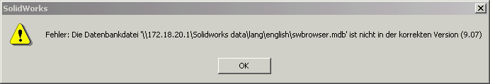Hallo Volker, ein Update auf SWX2005 bedeuted auch ein Update der Toolbox-Datenbank "..\Toolbox Parts\lang\English\SWBrowser.mdb" Wenn Du (so wie wir) abgeleitete Normen zur Toolbox hinzugefügt hast, dann werden diese beibehalten. Hast Du händisch die SWBrowser.mdb bearbeitet so kann es sein, dass Deine Änderungen weg sind. Die Toolbox-Parts bleiben unberührt. SWX2005 kann mit der alten mdb nichts anfangen (daher die Fehlermeldung) - meines Wissens nach kann man aber nach einem Update der Toolbox auf 2005 (unsere liegt im Netzwerk) mit SWX2004 noch damit arbeiten. Das Update der Toolbox legt automatisch eine Backup-Datei an (SWBrowser.mdbold) Viele Grüsse Andreas...  Eine Antwort auf diesen Beitrag verfassen (mit Zitat/Zitat des Beitrags) IP |
