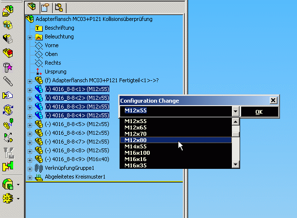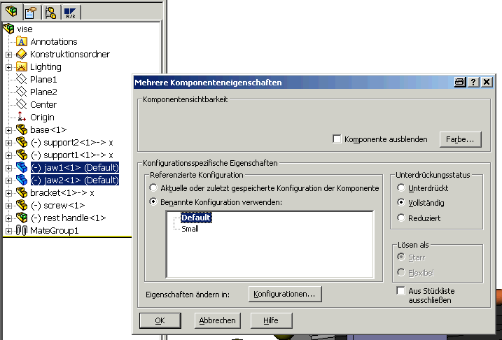 Hallo alle zusammen! Vielleich kennen manche folgendes Problem in SolidWorks 2004 - will man in einer Baugruppe die Konfiguration mehrerer gleicher Teile (z.B. Normteile) ändern, so muss man es bei jedem Teil einzeln machen (siehe Bild 1). Dazu habe ich ein Makro geschrieben (siehe Bild 2). Kennt jemand vielleicht einen anderen Weg? Gruß Alexander
