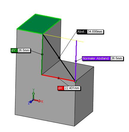 Das auslesen und berechnen der Werte funktioniert recht gut. Allerdings möchte ich dem User ein bischen dabei helfen leicht zu erkennen welcher Wert denn nun eigentlich was darstellt. Optimal wäre wenn ich Abstände, Winkel, Radien etc. wie mit der normalen SolidWorks Messfunktion mit farbigen Linien markieren könnte (die Schilder sind kein Problem). Der angehängte Screenshot zeigt besser was ich meine (auch wenn ihr wohl schon ein paar mal im SWX