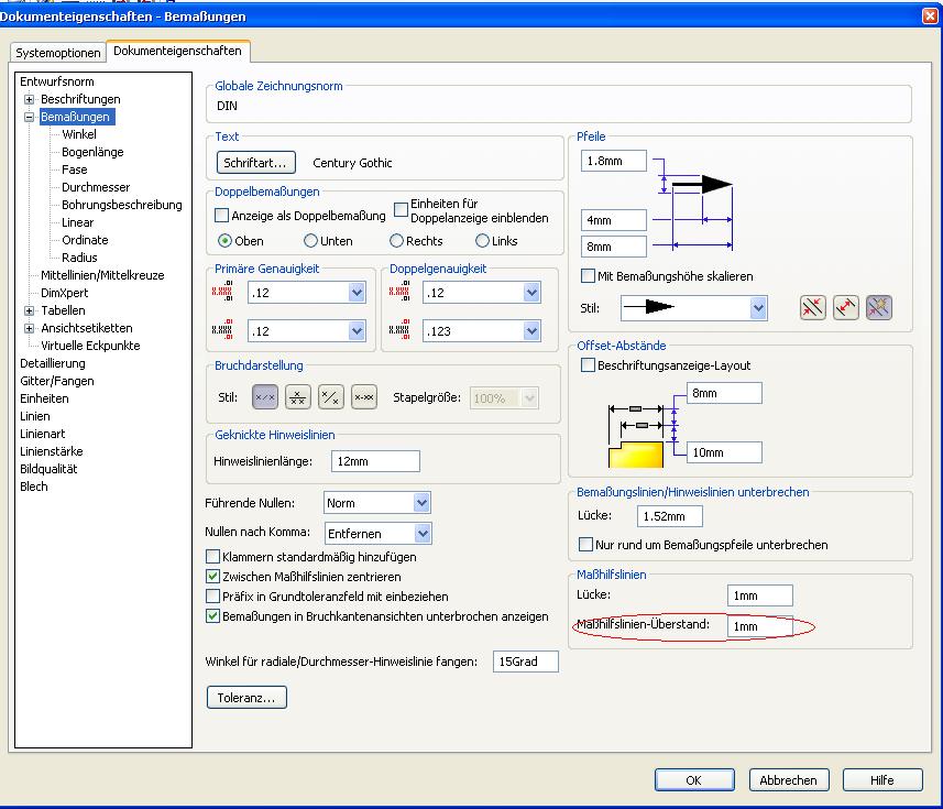Hallo, hier das Bild dazu. Edit: Ich sehe Du meinst eher im Modell. Da gibt es keine Einstellung. Die Maßhilfslinie geht immer genau bis zur Ebene auf der Deine Skizze liegt.