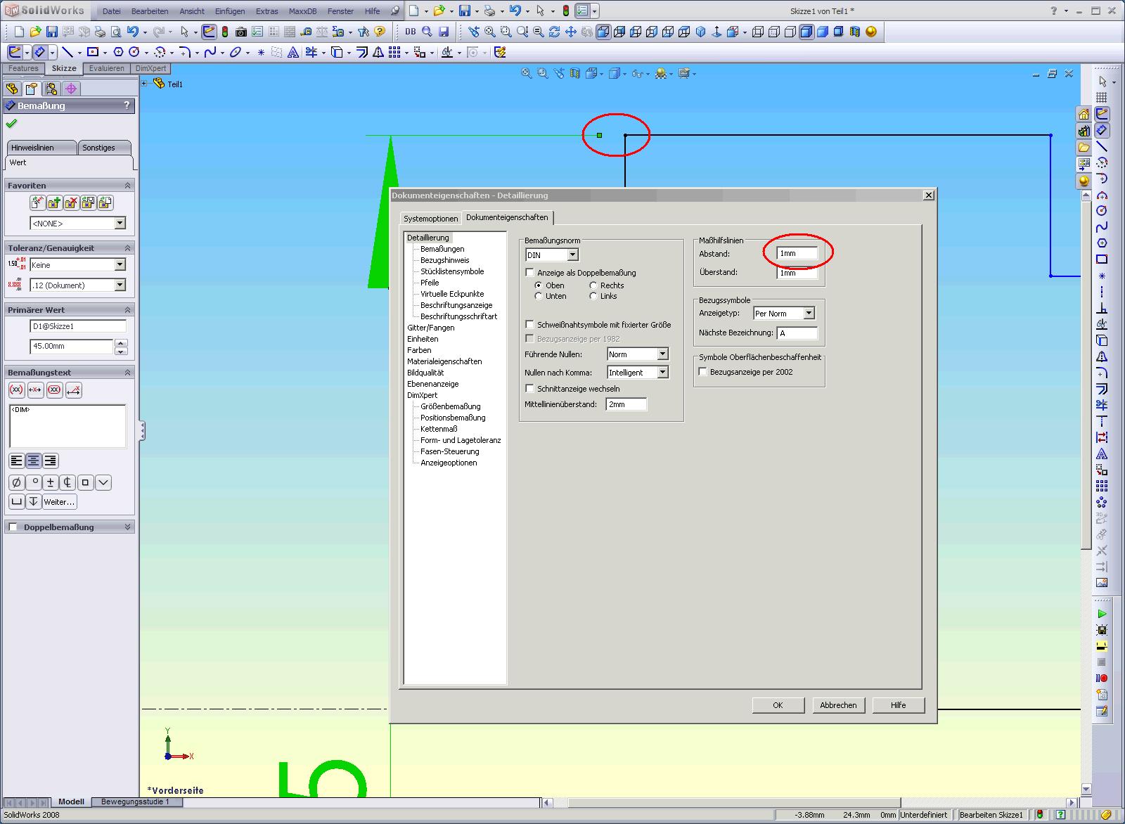 Anbei ein Bild aus SWX2008, damit Ihr seht dass man diese Option hatte. Gibt man 0 ein, dann geht die Maßhilfslinie auch bis an die Kante. So hätte ich es halt auch gern in SWX2009.
