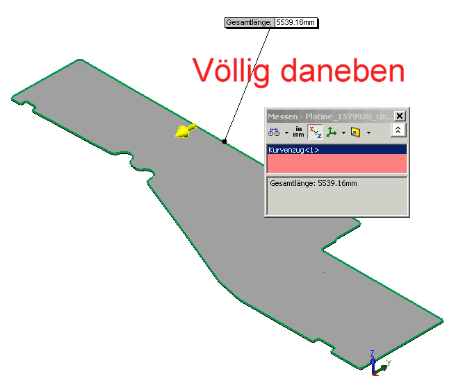 Vorsicht beim Messen! Wir mussten gerade feststellen, dass das Messen-Werkzeug mit vorsicht zu genießen ist. In unserem speziellen Fall geht es darum, die Umfangslänge einer Platte (Platine) zu messen, um daraus die Schnittkraft zu berechnen. Nichts leichter als das, denkt man. Kante anklicken, rechte Maustaste, "Kurvenzug auswählen", Richtung für den Kurvenzug auswählen, Messen-Werkzeug, Bingo. Denkste! Alternativ bei Platten ohne Löcher: Fläche anwählen, Messen, Bingo. Wenn man jetzt vergleicht, bekommt man beim gleichen Teil völlig unterschiedliche Ergebnisse! Das Ergebnis der gemessenen Fläche ist ok, das mit dem Kurvenzug ist voll daneben. Wenn man die Kanten aber einzeln mit der Strg-Taste anwählt und dann misst stimmt das Ergebnis auch, ist aber viel zu mühsam. So ein Mist! Jezt müssen wir, um den Umfang zu bekommen, immer erst alle Löcher schließen, dann können wir den Flächenumfang messen. Wie das bei entfalteten Blechen ist, die ja mehrere Flächen haben, hab ich noch gar nicht probiert. Oh je... ------------------ Klaus Danke für deinen Besuch in meinem Gästebuch! www.al-ko.de privat... ForumsChat: Schau doch mal hier rein, wenn du Zeit hast... Saga of Ryzom Eine Antwort auf diesen Beitrag verfassen (mit Zitat/Zitat des Beitrags) IP |