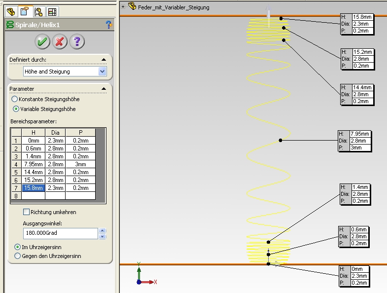 Hallo Pascal ich möchte gern für die verschiedenen Längen Konfigurationen anlegen. Die variable Steigung hat den Vorteil, dass ich nur eine Helix definieren muss und die Übergänge zwischen den wechelnden Steigungen sanft verlaufen. Ich möchte das hauptsächlich für Renderings verwenden um eine 1:1 Darstellung der Feder zu bekommen.