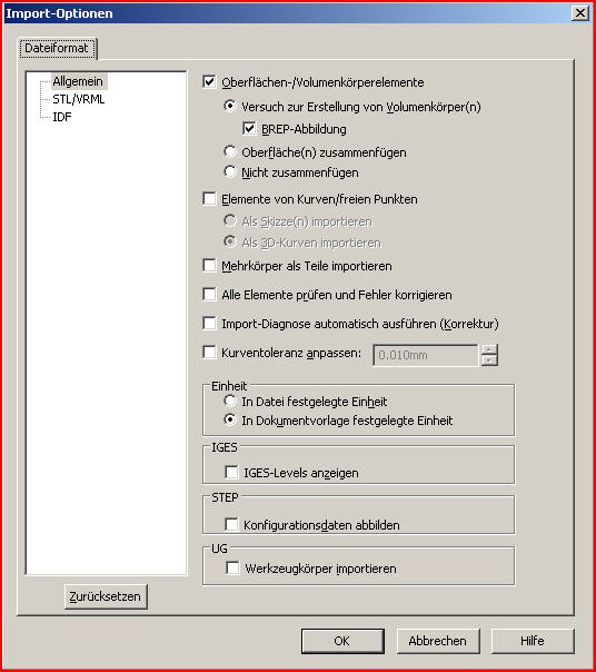 Hallo Ultraschaller, ich hab Dir mal ein Bildchen von meinen Einstellungen des IGES Import reingestellt, ansonsten kann ich mich den vorangegangenen Antworten nur anschließen. Falls Deinen IGES Datei nicht zu groß ist kannst Du die auch mal reinstellen. Gruß Gogoslav