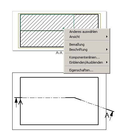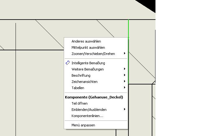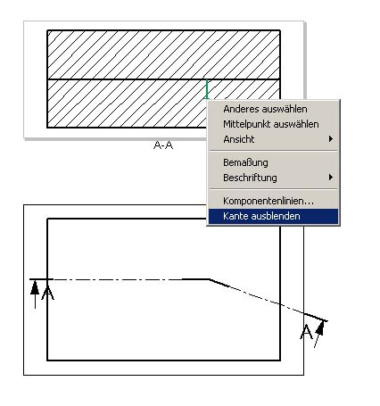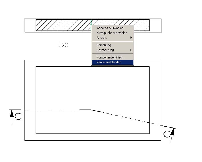 Hallo PeterKlaus was ich seltsam finde an deinem RMT-Menue 12.JPG, ist der Punkt "Komponente... Teil öffnen". Diese Möglichkeit habe ich nie bei einer Schnittansicht, sondern nur bei ungeschnittenen, und auch dann nur wenn ich eine Fläche anwähle. Bei Kantenanwahl erscheint dieser Punkt nicht. Mein Vorschlag ist die die Kante nicht ausblenden, sondern ändern in eine dünne strichpunktierte Linie. (So habe ich das mindestens einmal gelernt, vor langer Zeit, in einer weit entfernten Galaxie....)  Gruss Markus ------------------ Zeit, das Wertvollste das wir haben, wird vertrieben und totgeschlagen. Eine Antwort auf diesen Beitrag verfassen (mit Zitat/Zitat des Beitrags) IP |