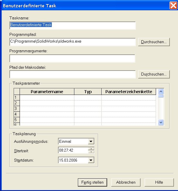 Hallo! Ich hab zwar keine 100% Lösung, aber eine unfähre Richtung. Normalerweise würde ich Dir den SolidWorks Taskplaner empfehlen. Der kann aber aus irgendeinem Grund nur Step und Iges. (siehe Anhang 1) VDA ist nicht dabei. Du wirst wohl um ein Makro nicht rumkommen. Das könntest Du dann aber bei Bedarf im Taskplaner zeitgesteuert starten. ------------------ Gruß, Florian Eine Antwort auf diesen Beitrag verfassen (mit Zitat/Zitat des Beitrags) IP |
