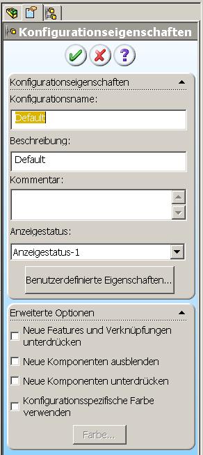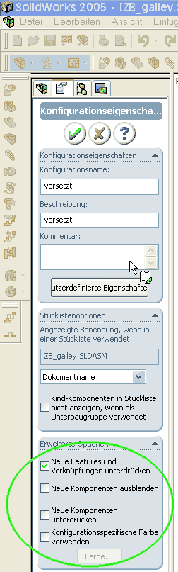 Hallo @ all, also ich hab das ganze jetzt nochmals in SWX 2005 & 2006 versucht und mir ist aufgefallen, das wenn ich beim erstellen einer Konfi die Erweiterte Optionen "Neue Komponente unterdrücken" anhacke nicht übernommen wird! @ Lothar: den Anzeigestatus gibts erst ab 2006; ------------------ ____________ Bernd  Eine Antwort auf diesen Beitrag verfassen (mit Zitat/Zitat des Beitrags) IP |