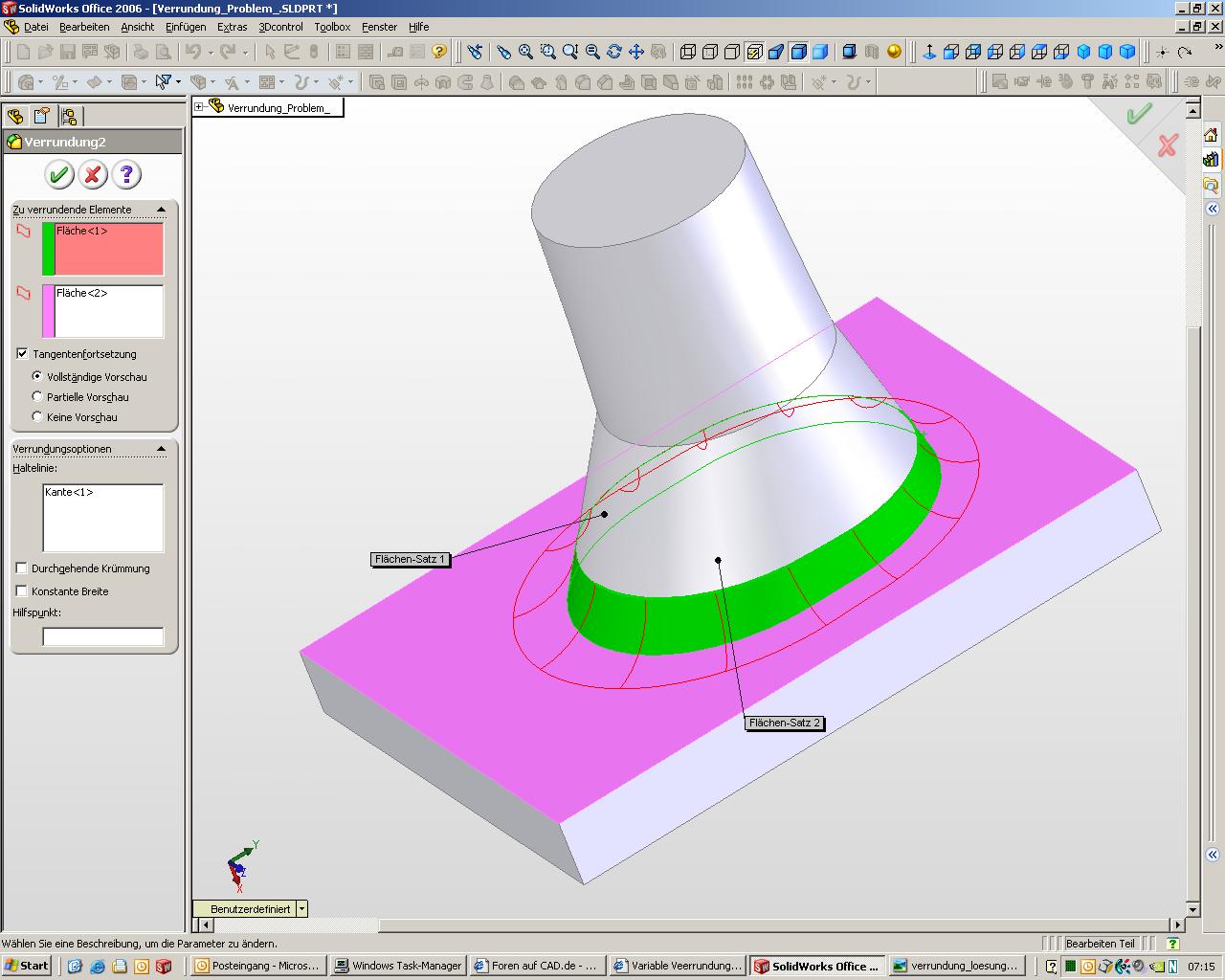 Hallo Andreas Ein weitere Lösungsansatz ist die Flächenverrundung mit Haltelinie. An die Radiengrössen muss man sich allerdings empirisch herantasten. Zum messen muss man Kreise einzeichnen, weil die Projektion nur Splines produziert. Aber zuerst wie von Michael erwähnt, die Grundfläche vergrössern. Gruss Markus P.S. Hoffentlich klappt das mit dem Bilderupload. Edit: Habe vergessen zu erwähnen, dass ich die Haltelinie mit der Funktion Trennlinie erstellt habe. ------------------ Zeit, das Wertvollste das wir haben, wird vertrieben und totgeschlagen. [Diese Nachricht wurde von Markus Brunner am 06. Apr. 2006 editiert.] [Diese Nachricht wurde von Markus Brunner am 06. Apr. 2006 editiert.] Eine Antwort auf diesen Beitrag verfassen (mit Zitat/Zitat des Beitrags) IP |