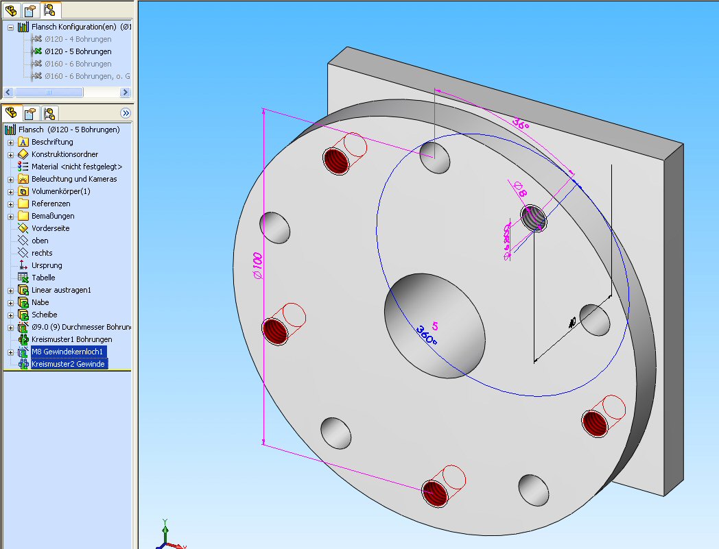 Hallo Ralf, habe dir einen Beispiel-Flansch (Flansche sind mir nicht so geläufig) mit mehreren Tabellen-Konfigs als SLDLFP erstellt, den du kpl. als Bib-Feature einfügen kannst. Wähle beim Einfügen zuerst eine planare Fläche, wo der Flansch angebracht werden soll, dann eine zyl. Fläche zur Zentrierung aus. Jetzt noch die Konfig festlegen, das wars. Um Gewindemaße in eine Tabelle übertragen zu können, muss man im Feature-Manager auf das jeweilige Feature doppelklicken, dann erscheinen alle hierfür erforderlichen Parameter. Das gleiche gilt auch für das Muster-Feature, siehe JPG (hier die Zahl 5, = Anzahl der Gewinde) und auch für sonstige Features. ------------------ Gruß, Walter Eine Antwort auf diesen Beitrag verfassen (mit Zitat/Zitat des Beitrags) IP |