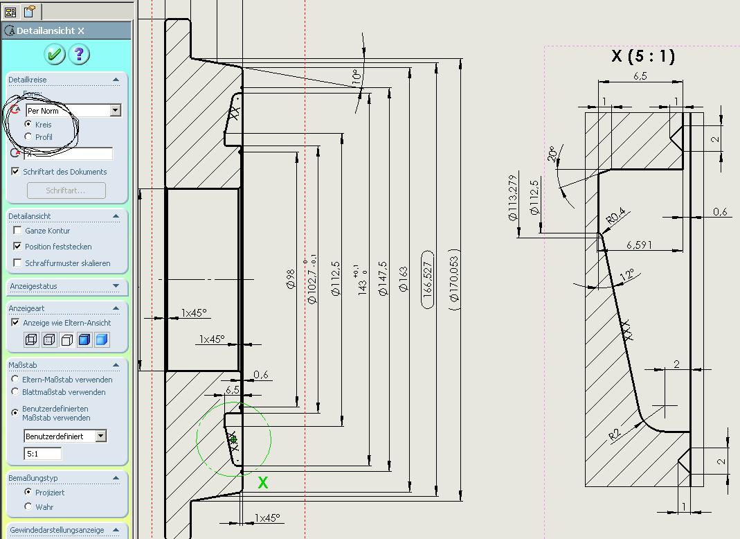 Hallo rawo, Jetzt bin ich verwirrt. Wie möchtest du es denn haben, mit dem Detail? Du kannst ein x-beliebige Form als Detail verwenden, nur die Fantasie setzt da die Grenzen. Einfach eine geschlossene Skizze über dem gewünschen Zeichnungsausschnitt erstellen, die Skizze selektieren, die Detail- Funktion anwählen, und dann von Kreis auf Profil umstellen.